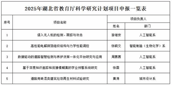 根据2025年度湖北省教育厅科学研究计划项目申报要求,经各项目负责人申报、所在单位推荐、专家评审,现将我校拟推荐申报项目予以公示: